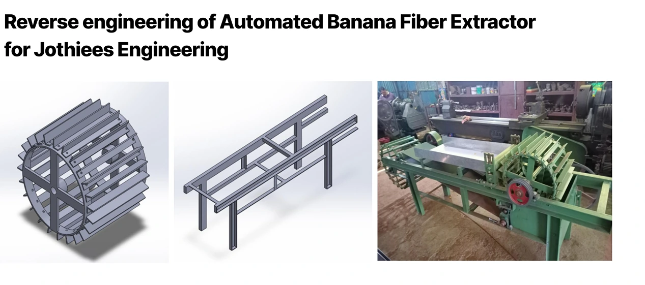 In collaboration with Jothiees Engineering, we embarked on a meticulous teardown and analysis of their automated banana fiber extractor machine. Our comprehensive approach involved disassembling parts and assemblies, conducting precise measurements for each component, and subsequently generating detailed 2D technical drawings for the entire system.